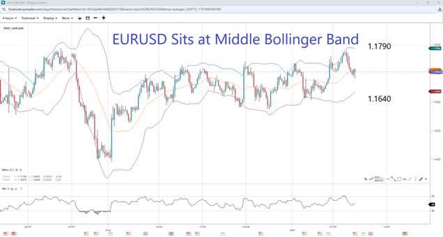 Geopolitical concerns have left the dollar a little stronger over the last couple of days, pulling the EURUSD off recent highs. But this has left the pair near the middle Bollinger Band at 1.1700. A break below would find support at the 1.1640 level, the BB low, followed by 1.1600 and the August month low of 1.1575. A turn upwards would encounter the 1.1750 round resistance, with the nearest swing high at 1.1790 coinciding with the upper BB.
