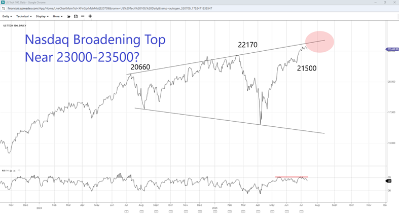 The tech-heavy index is pulling back after the RSI reached the overbought zone and prices formed a double top at 22850. Although declines could continue in the short term, exposing 22170 and the 21500 regional support, Nasdaq did not fully extend to the upper trendline of a potential broadening wedge pattern. In doing so, it could discover new prices within the 23000-23500 territory, with a test of the trendline triggering a potential reversal. One of the first signs of confirmation would be breaking below the lower trough of the pattern at 20660.