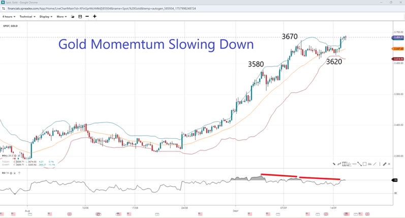 After three weeks of solid gains following the Jackson Hole Symposium in August, the upward trajectory of gold had taken a breather over the last week. But it appears to have been just a temporary pause even ahead of the Fed's rate decision, as the RSI extended to the overbought zone and gold to record highs. A continuation of the upward move would clear the way towards the round $3750 level if $3700 gives way to bulls. If the Fed appears more hawkish than anticipated, then gold prices could turn around as the RSI shows a double divergence. Support below $3670 could be seen at last week's low, which coincides with the lower Bollinger Band at $3620, with a breakdown heading towards the prior swing high of $3580.