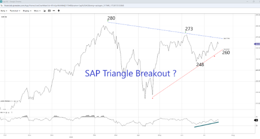 For most of last month, SAP's share price rose, with some profit-taking going into the weekend and ahead of the earnings announcement. With the RSI trending upwards, a continuation of the move could hit resistance at the upper ‘autotrend’ line of a potential symmetrical triangle near €270 per share. A breakout of the triangle, however, could open the door to the Q2 high of €273 and the 2025 peak of €280 as the formation appears near-complete. On the flip side, support lies at the middle band at €260, with the next swing at the lower end of the triangle at €248.