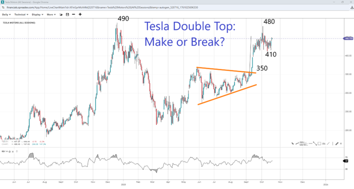 Tesla trades near its 1-year high of $490 per share, following a triangle breakout with a completed measured-move extension to around $450. Given the proximity to last December’s swing high, the current price action can be considered a double top, leaving the stock’s outlook under question. A break of $480 could set the stage for $500 and beyond if earnings beat expectations, while a disappointing report could see prices slide under $410 and towards the triangle breakout level of $350.