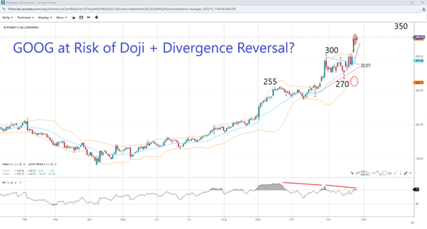 Nvidia is far from record highs, while Alphabet is bursting through new levels near $330 per share after breaking outside a pennant pattern, continuing its parabolic move. However, with RSI overbought and showing double divergence, the measured-move projection overachieved, and a doji candlestick formed on Tuesday, the stock is at risk of a reversal towards the $300 handle. Losing the round level would open the door to $270, the pennant low, with further drops exposing $255. On the other hand, if the VWAP extremes continue to expand directionally, GOOG might eye $350 next.
