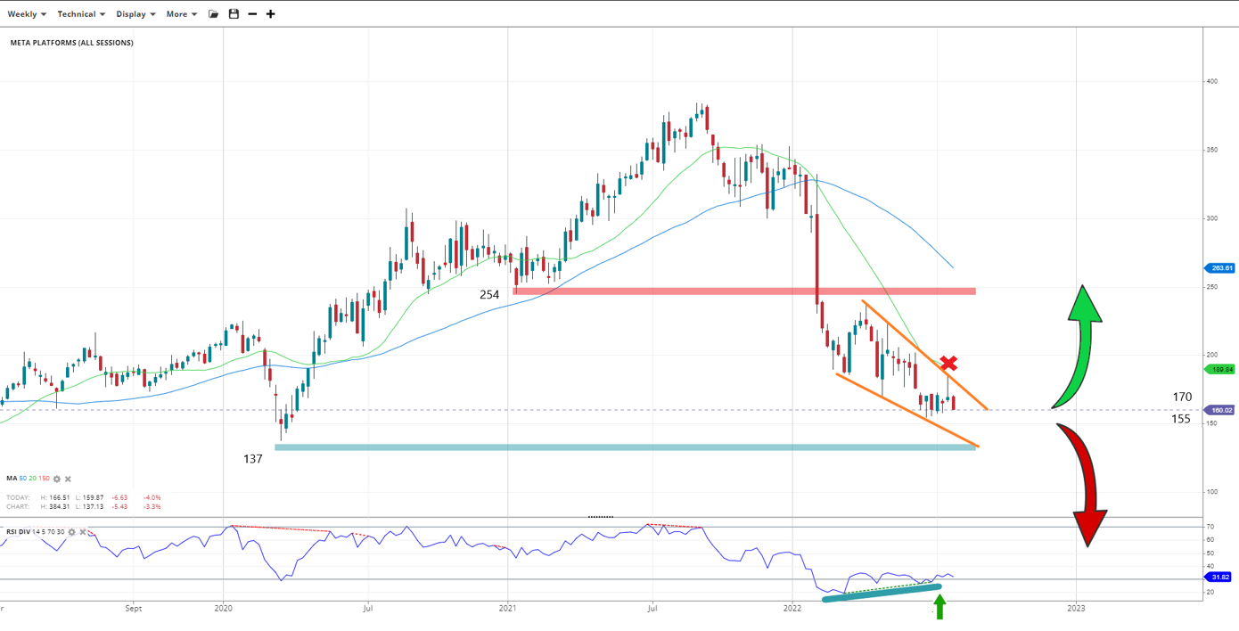 The share price of Meta is in a bear market but some mean reversion is possible ahead of the 2020 low.