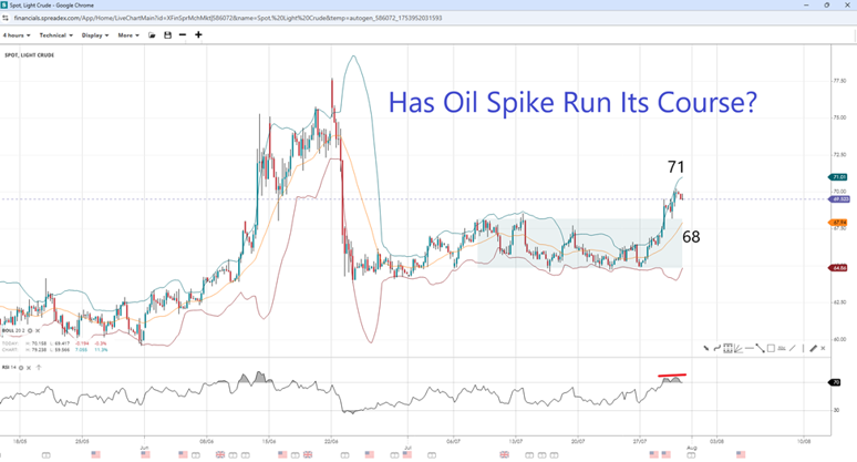 Other events that were the EIA report showing strong gasoline demand. Geopolitics interfered as well, after US President Donald Trump announced he was shortening the deadline for Russia to reach a peace agreement with Ukraine to 10-12 days. He threatened "secondary" sanctions on countries that bought Russian oil, such as China and India. The US also announced new sanctions targeting shipments of Iranian crude. In the other direction, the Fed's hawkish position following its decision not to cut rates raised demand concerns.