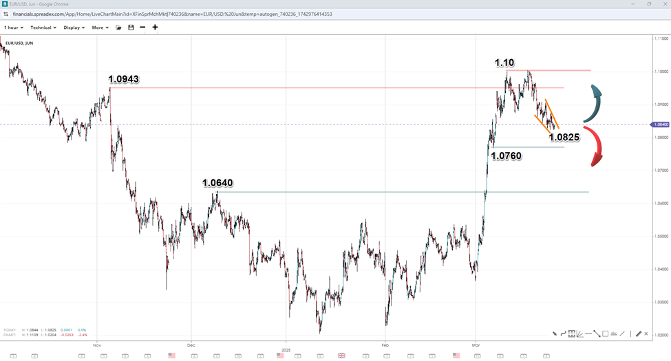 The Fed's cautious approach and downward revision of growth forecasts, coupled with persistent inflation concerns, have fuelled market nervousness about the US economic outlook. But while safe-haven flows have provided support for the EURUSD, the potential moderation of tariff policies introduces a new layer of uncertainty unless data convincingly signals an opposite trajectory.