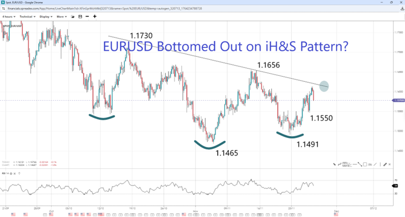 Fibre appears to be consolidating between 1.1656 and 1.1491 after bottoming out at 1.1467 in early November, with the recent peak at 1.1613 acting as a potential rejection of a major descending trendline. Despite corrections typically leading to trend continuations, the entire formation resembles an inverse head and shoulders, with the neckline breakout above 1.1600 increasing the odds of EURUSD rising towards 1.1730 (the measured-move projection comes over 1.1800).  If the short-term drop towards 1.1550 reverses course or prices fail to decline as low as the 1.1500 shoulder, the chart pattern could play out. However, losing the swing bottom would bring 1.1491 back into focus, exposing 1.1465 and the major supports of 1.1450 and 1.1400 on the way down.