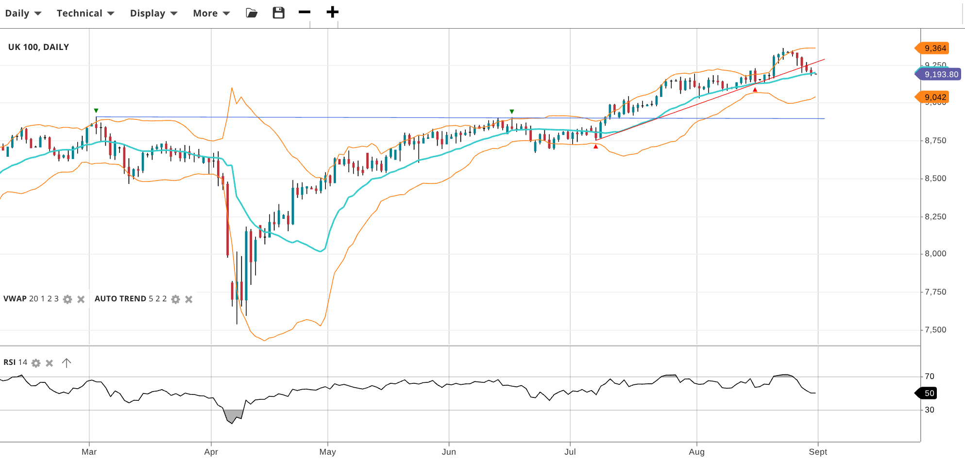 NOTE: These charts use the ‘Pro Trading Tools’ available on the SpreadEx trading platform. To use them, log in to your and click ‘Technical’ from the menu on any chart.