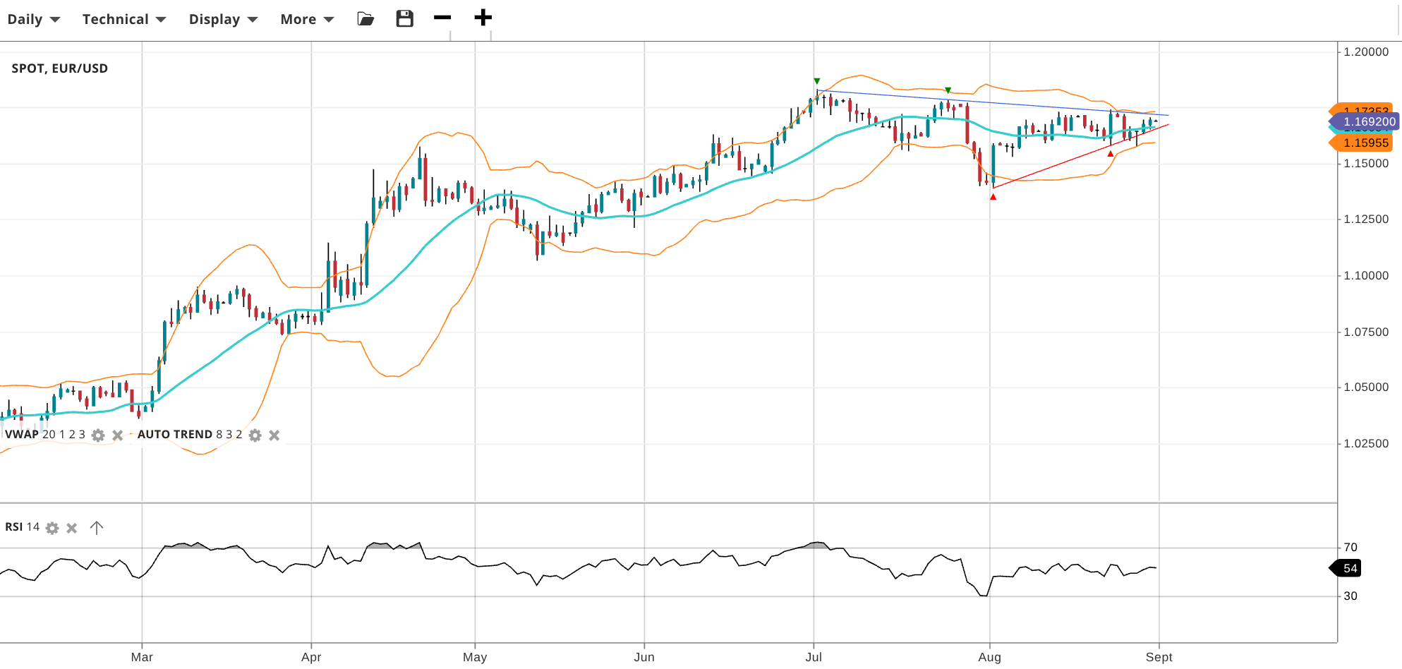 EUR/USD is testing the highs, trading at 1.1692 above VWAP 1.1692. RSI at 54 suggests balanced momentum. Support is 1.1596, resistance 1.1735.
