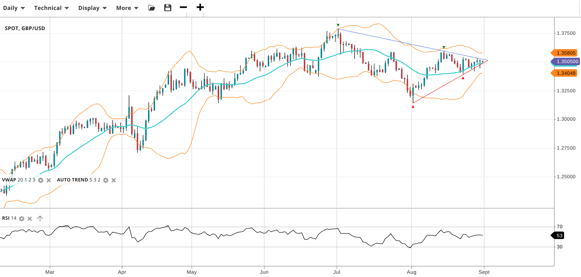 GBP/USD is consolidating in an extended correction of a bullish trend, trading at 1.3505 near VWAP 1.3500. RSI at 53 signals a stable tone. Support is 1.3405, resistance is 1.3581.