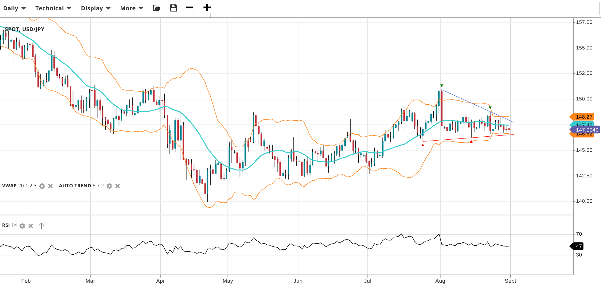 USD/JPY stays range-bound at 147.00, now just below the VWAP at 147.45. RSI at 47 reflects a neutral outlook. Support is 146.60, resistance 148.27.