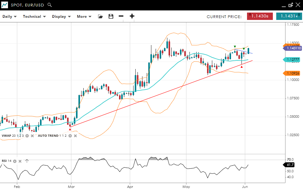 EUR/USD is bullish and possibly readying a bullish breakout after a correction phase. Price is at 1.14314, well above its VWAP of 1.1277. The RSI at 61.7 hints at renewed buying interest. Support is at 1.10926, with resistance at 1.1460.