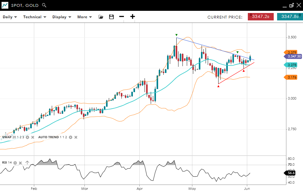 Gold is attempting an upside breakout above the autotrend line, following a consolidation phase, currently at 3,347.8 above its VWAP of 3,278. The RSI of 56.6 suggests a slight upside bias. Support is at 3,176, with resistance at 3,379.