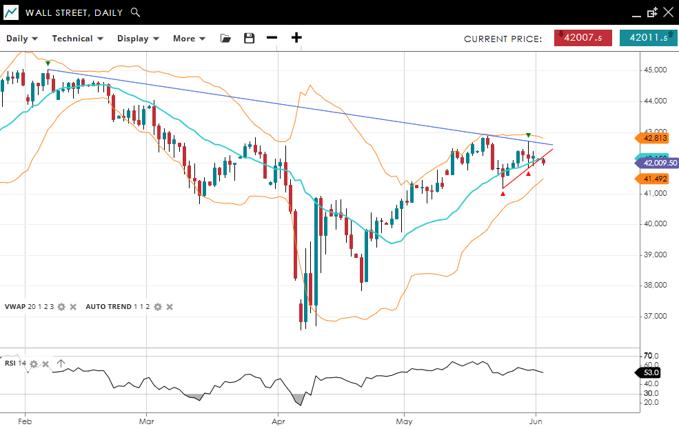 Wall Street is undergoing a correction of its bullish trend, trading at 42,009, just below the VWAP at 42,150. The RSI of 53.0 suggests a balanced market, with potential for either continued upside or a deeper pullback. Support is at 41,492, while resistance is at 42,813.