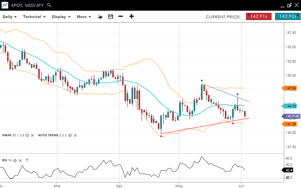 USD/JPY remains in a correction of its bearish trend, with price at 142.92 just above major support near 142.50 and below its  VWAP at 144.72. The RSI at 42.4 suggests a neutral to bearish market. Support is at 141.59, with resistance at 147.86.