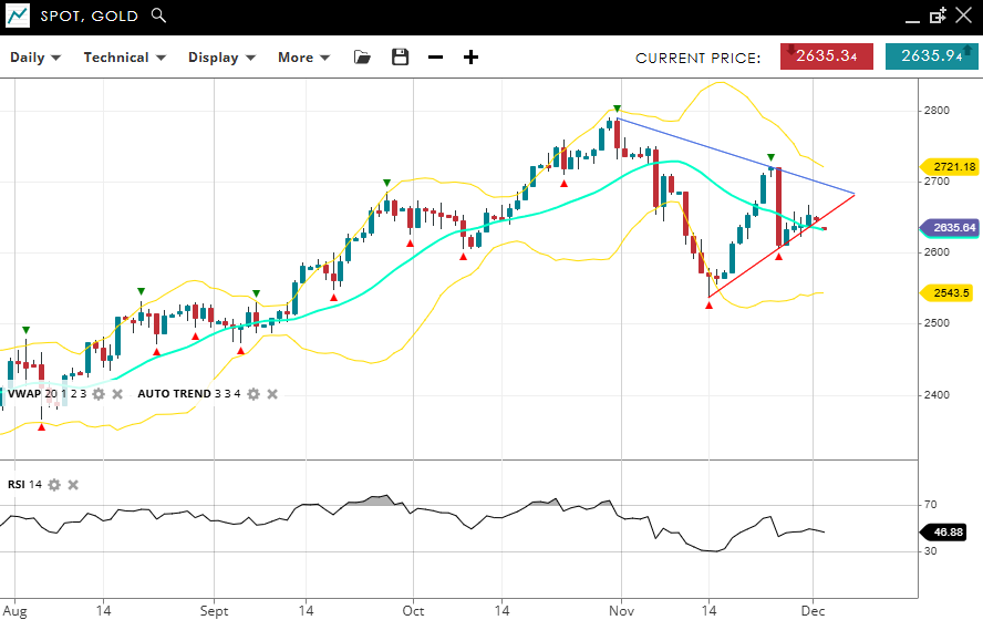 Gold has flipped into a more neutral consolidation phase, trading at 2,635, near the VWAP (20) of 2,630. Support is positioned at 2,543, with resistance at 2,721. The RSI at 46 indicates lackluster momentum, suggesting continued consolidation within a new range beneath record highs.