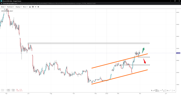 Bitcoin has extended higher without much momentum, printing a false break and imprinting a double-top formation. If bears add to the profit-taking positions, the break of 26500 might be crucial for the medium-term price action of BTC, as it would encourage a move down to 23180. In the opposite direction, spiking over the peaks might see an extension to 30k, with 32350 a weekly max.