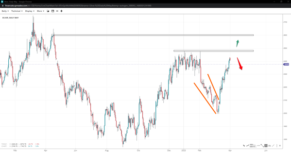 Silver advanced higher, headed towards $26/oz should the local peak of $24.80/oz wane, leaving a flag imprinted. Finding stiff resistance at either level might shift the commodity towards 22.20/oz or 21.40/oz.