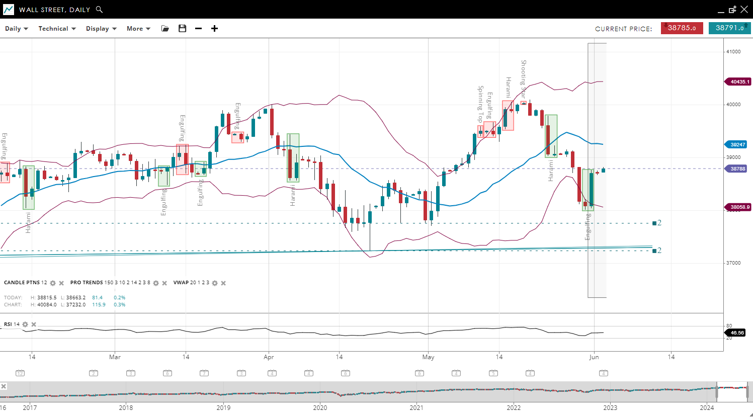 Wall Street seems to have settled into a sideways/neutral trend, with the price decreasing notably before rebounding to 38,788, below the previous VWAP of 39,247. Support and resistance levels have adjusted to 38,058 and 40,435, respectively. The RSI has decreased slightly to 46, signalling a reduction in bullish momentum compared to the previous report. Concerns over U.S. debt ceiling negotiations have weighed on the market.