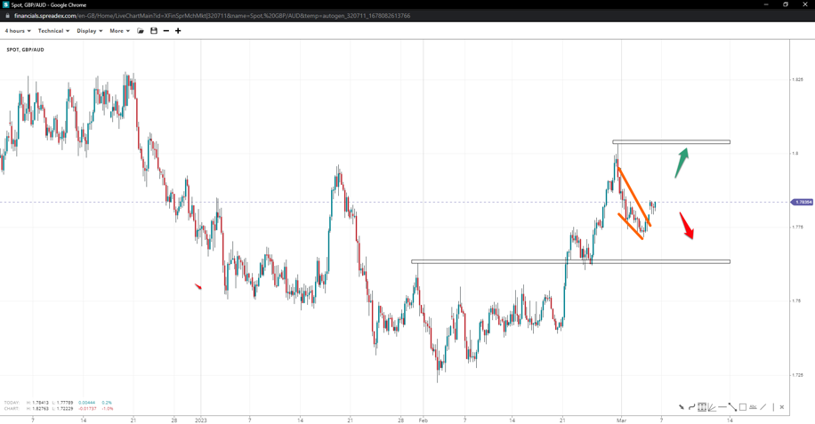 GBP/AUD appears in a corrective mode, likely a flag pattern, expected to rise past the top of 1.8031 in the near future. If the swing low at 1.7715 and the 1.7700 round level give in, the next major support lies at 1.7623.