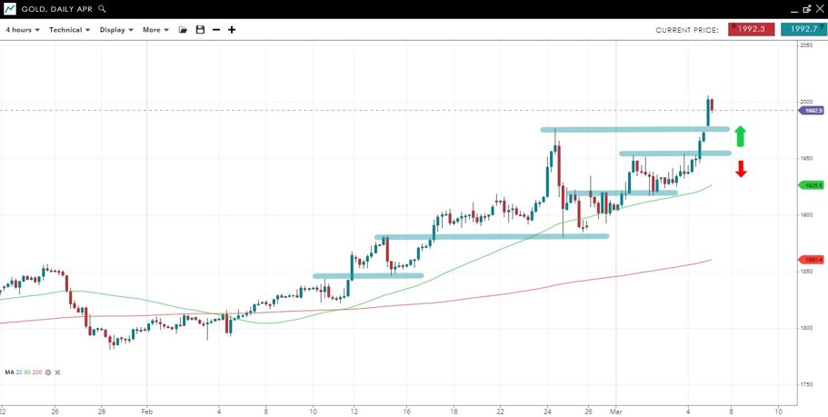Price has gapped over the Feb 24 spike high to reach the psychological 2000 level, where it saw light profit-taking.