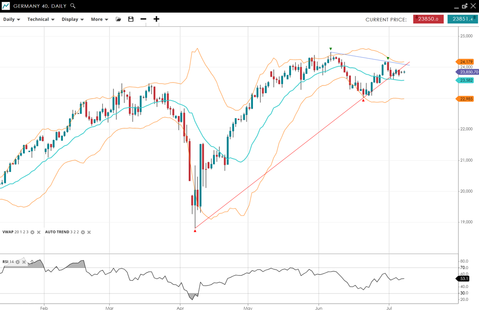 Germany 40 is currently in a neutral trend, moving within a range phase. It's trading at 23,851, holding above its VWAP of 23,582, suggesting limited directional conviction. The RSI at 53 indicates a balanced market. Support is at 22,985, while resistance is at 24,179.