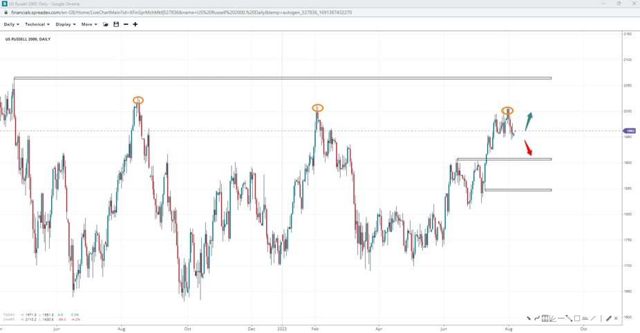 A triple-top formation has raised the chances of further declines in Russell unless bulls can reclaim 2025 for an attempt at 2060. Lack of bullish momentum may provoke downward price action towards 1910, with support lower down at 1850.