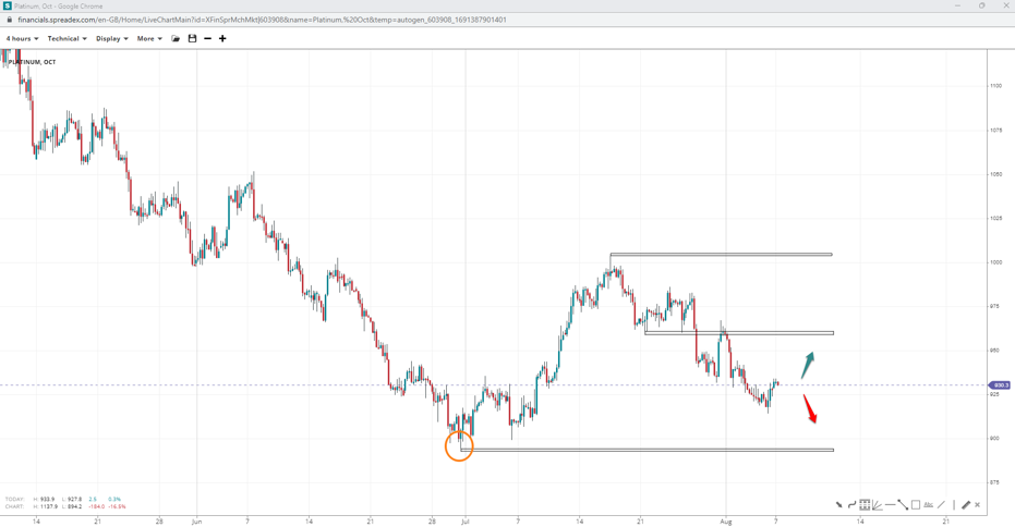 Platinum prices slid near the regional low at $900/oz to raise speculation for a double-bottom formation. If bulls can recapture $960/oz before further drops, the chances of falling to the base will reduce, with the probability of reaching triple digits increasing. A lack of bullish momentum at the bottom may open the door to $880/oz.