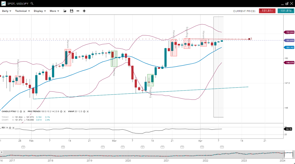USD/JPY has maintained its bullish trend, tracking sideways while still in the impulsive phase, with its price slightly increased to 151.81, above the 20-period VWAP of 150.11. The support has been adjusted up to 149.57, with resistance at 152.64. The RSI at 64 indicates a slight decrease in bullish momentum compared to the previous reading.