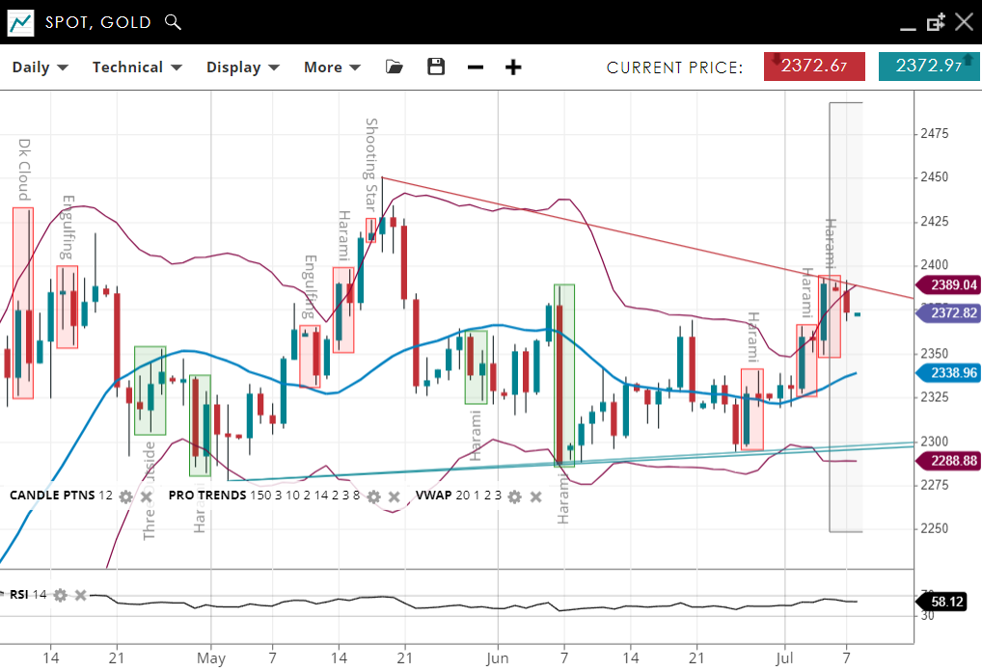 Gold remains in a sideways trend but has just broken the June peak, with the price recently increasing to 2,372, now around the previous VWAP of 2,338. Support has adjusted higher to 2,288.88, while resistance has increased to 2,389.04. The RSI has gotten stronger to 58.12, indicating the potential beginnings of a new period of higher momentum.