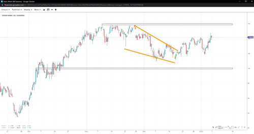Exxon seems to be consolidating, but above the 100-round level, it remains biased up. Closer to 110 than 105, bulls could boost the stock towards the 115 top and beyond as the pennant appears complete. Due to structural overlaps, however, we are unlikely to see a successful breakout past the local top, as price action seems corrective, leaving the stock sensitive to interpretation.
