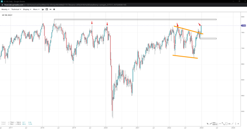 The UK 100 index soared to the multiyear high marked above 7700 following a pennant, but the risk of a quadruple top formation remains elevated this week. 7900 is the May 2018 resistance below the 8k handle in a breakout case unless a rejection shifts price action towards 7300. In the interim, 7500 could act as support if bears managed to send the index below the swing of 7625.