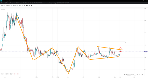 The stock could have put a low in, given its resemblance with an inverse head and shoulders pattern. Equally, the current consolidation seems to be in a triangle pattern, looking for an imminent breakout. Breaking past 145.00 could get us to 160.00, where an initial rejection can be expected. But if the stock slides towards the low at 100.00, it will increase the chances of failure and open the door towards 50.00 again.
