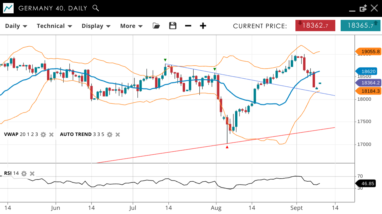 Germany 40 is in a bullish trend, currently in a corrective phase with the price at 18,364, slightly above the VWAP of 18,184. Support and resistance levels stand at 18,184 and 19,055, respectively. RSI is at 46, indicating mild bullish momentum.