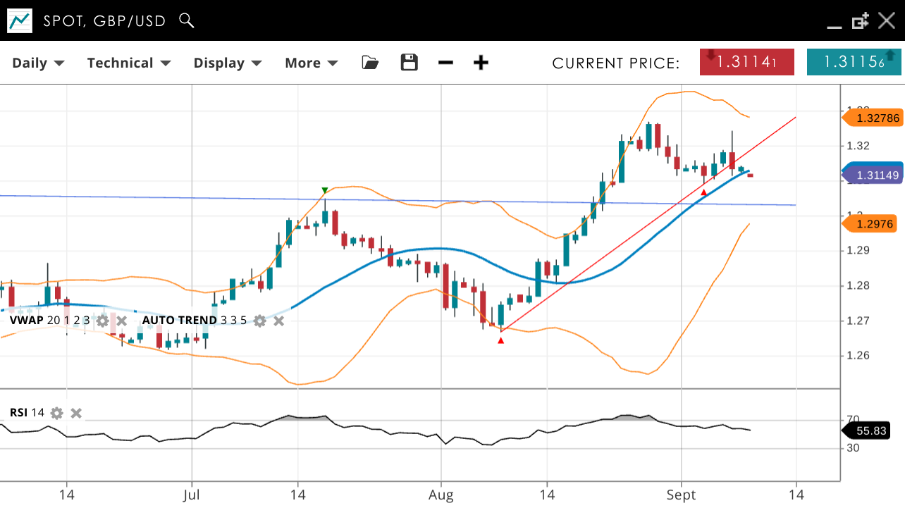 GBP/USD continues in a bullish trend, now in a corrective phase with a bearish daily engulfing candlestick causing a fakeout over 1.32. The price is at 1.3114, under the VWAP of 1.3115. Support is at 1.2976, with resistance at 1.3278. RSI at 55 suggests ongoing bullish momentum.