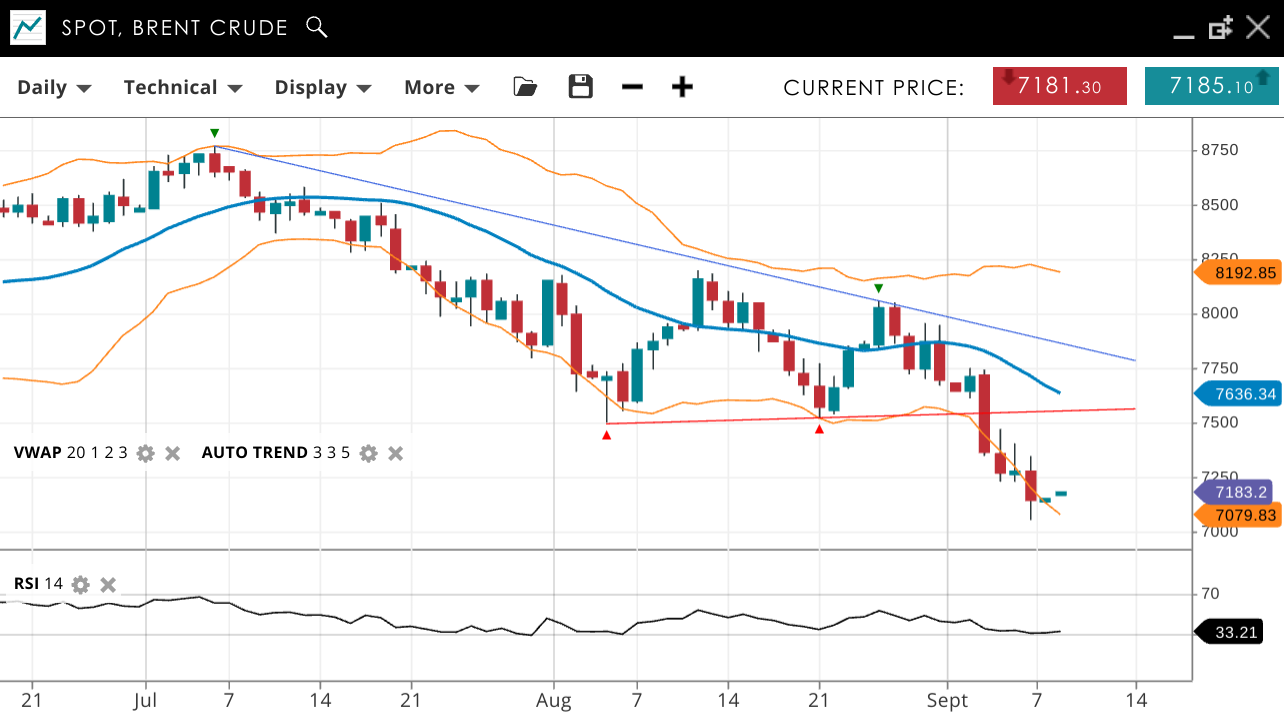 Brent Crude continues its bearish trend with fresh multi-month lows. The price is 71.83, below the VWAP of 76.36. Support is at 70.79, with resistance at 81.92. The RSI is 33, indicating strong bearish momentum.