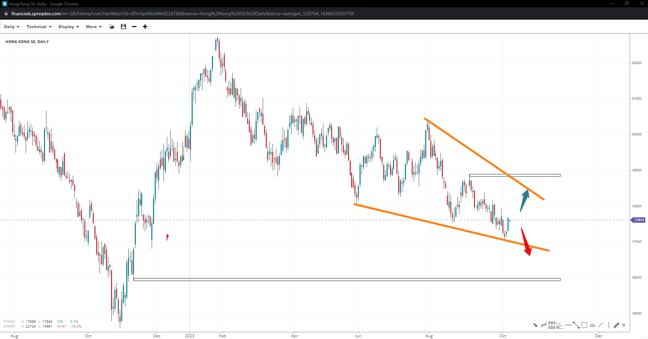 Despite rising in the short and perhaps medium term to 19k, the Hong Kong 50’s index may be due another leg down, completing a wedge if one has not ended already at 17k. Losing the regional floor could clear the way to 16k.