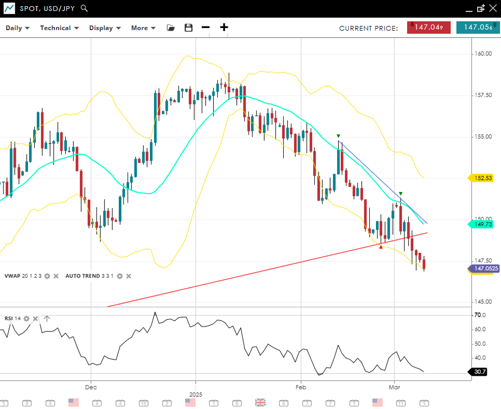 USD/JPY remains in a bearish, impulsive phase, quoting at 147.05, under the 20‐day VWAP of 149.73 as well as the December lows. The RSI reading of 31 indicates oversold conditions or strong downward pressure. Support lies at 145.21, and resistance at 152.53 must be overcome to challenge the prevailing downtrend.