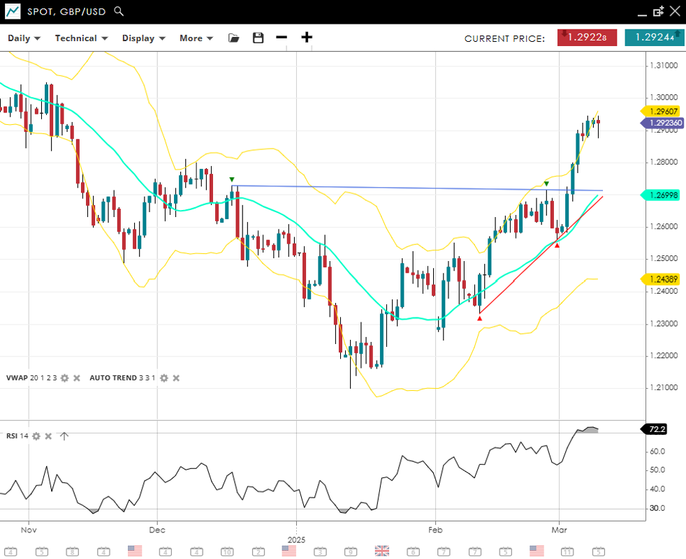 GBP/USD continues its bullish, impulsive ascent, trading at a 3-month high of 1.2923, above the 20‐day VWAP of 1.2700. An RSI of 72 signals elevated momentum, nearing overbought territory. Support comes in at 1.2439, while resistance at 1.2961 is now in close reach.