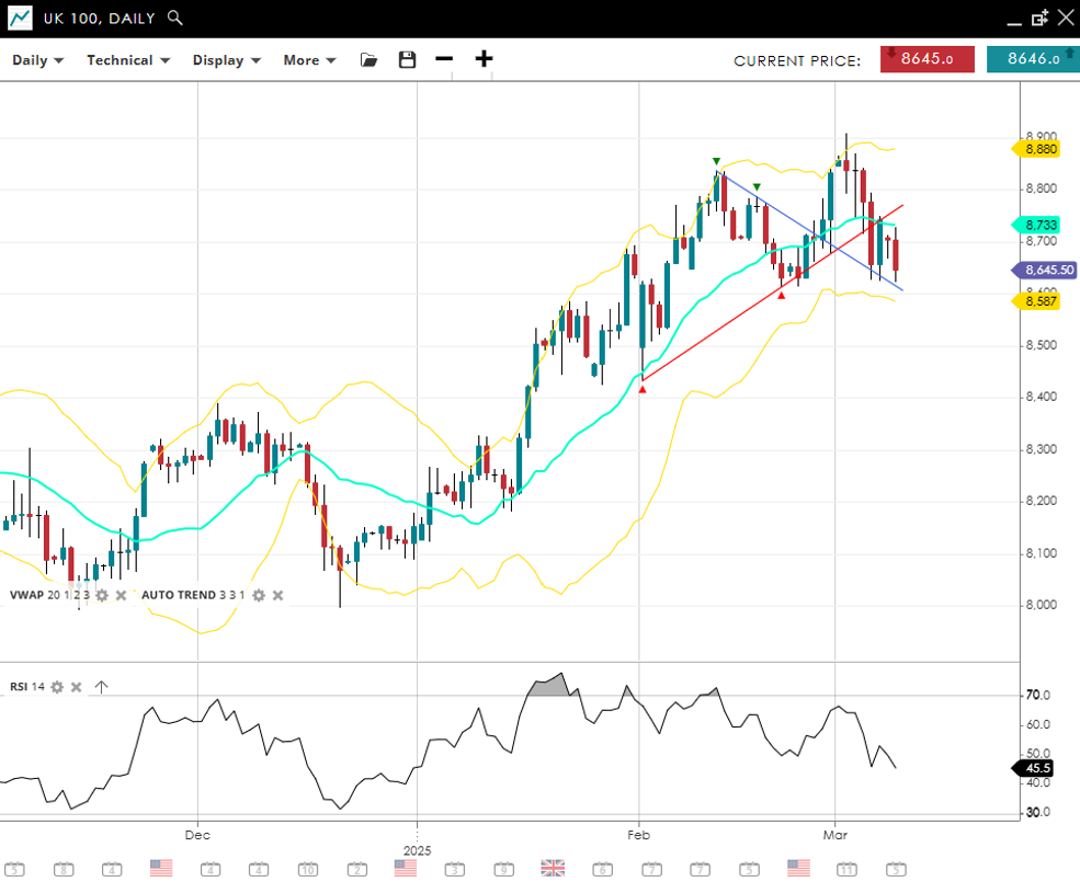 The UK 100 maintains a bullish trend but has entered a corrective phase, trading at 8,646, below the 20‐day VWAP of 8,733. Momentum has cooled, reflected by an RSI of 46 back below the key 50 threshold. Support can be found at 8,587, while resistance sits at 8,880.