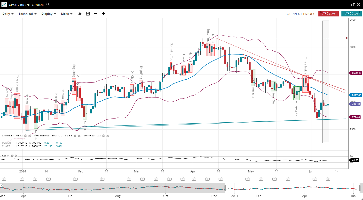 Brent Crude remains in a bearish trend and continues in an impulsive phase, with the price decreasing to 79.64 and probing the April lows and 75.00, below the VWAP of 81.27. Support has adjusted lower to 77.24, while resistance has increased to 85.30. The RSI has decreased to 41, indicating a strengthening of bearish momentum compared to the previous report.