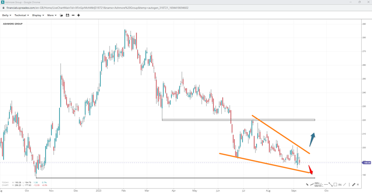 The price of Ashmore has either completed or is near completing a wedge pattern, with chances of easing to the low of 176.80 still high. Breaking the short-term swing at 184.70 may see prices form a double bottom without invalidating the wedge. If a takeover of 201 leads to a move towards 220, the pattern will likely be completed.