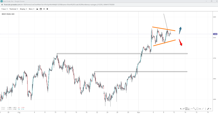 While the pattern in Brent appears to be a short-term consolidation, it also resembles a triangle pending breakouts towards $93/bbl. The final trough may not be completed, but above $89.30/bbl the pattern will likely prevail. Sliding lower will bring $88 a barrel closer.