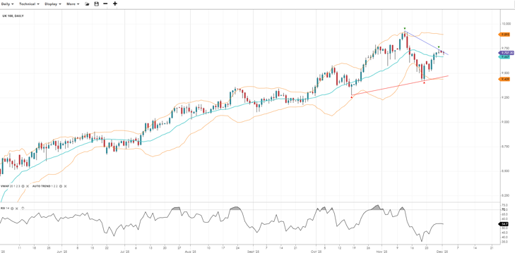 UK 100 continues to trend bullishly but is rebounding inside a correction phase. Price is at 9,707, just above the VWAP of 9,667. RSI at 54.7 reflects neutral momentum. Support is 9,439, with resistance at 9,895.