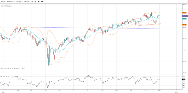 Wall Street remains bullish but is now in a correction phase, trading at 47,515 above the VWAP at 46,903 but below former highs. RSI at 56.9 suggests a resumption of bullish momentum. Support is at 45,592, resistance at 48,214.