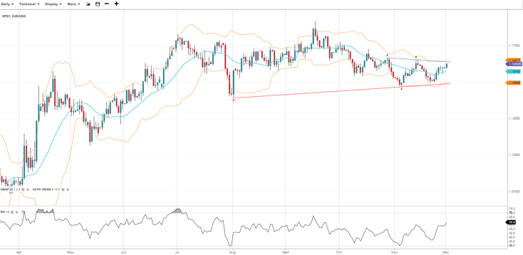 EUR/USD continues within a neutral range, having not taken out significant formers lows, trading at 1.1626 slightly above VWAP of 1.1574. RSI at 58.8 signals modest bullish bias. Support is 1.1497, resistance at 1.1652.