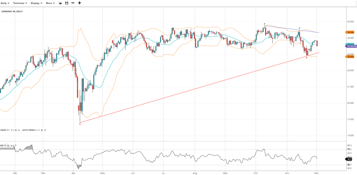 Germany 40 is in a neutral range after avoiding a major breakdown, trading at 23,503 near the VWAP of 23,616. RSI at 44.9 indicates indecision. Support is at 22,866, resistance at 24,366.