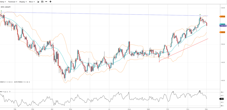 USD/JPY is undergoing a pullback within its bullish trend after testing multi-year highs, trading at 155.12 under the VWAP of 155.50. RSI at 50.8 reflects balanced momentum. Support is at 153.35, resistance at 157.66.