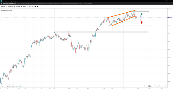 Eurostocks 50 has formed a wedge pattern by the 4275, suggesting a pullback, if not a reversal, is at play. If the index reclaims the top, we might see the pattern completing a more extensive leg towards 4300. Further drawbacks could bring the 4100 support back into the spotlight.
