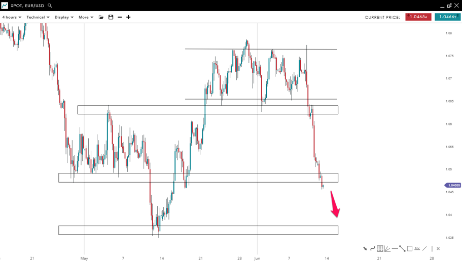 EUR/USD has been bouncing inside a parallel channel formation since the end of May. The price finally broke this pattern to the downside where it posted lower lows and highs with brief corrections. The market is sitting now right above a strong support level which is the 1.0480 mark. We could see a slight correction to the upside before a new bearish impulsive wave toward the 1.0365 mark.