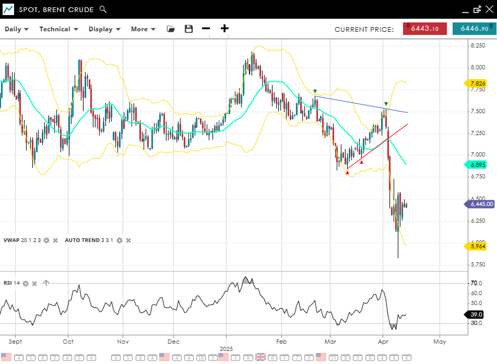 Brent Crude is in a bearish impulsive move, with price down to 6,445, firmly beneath the VWAP of 6,895. RSI at 39 signals persistent bearish pressure. Immediate support lies at 5,964, and resistance caps upside potential way back up at 7,826.